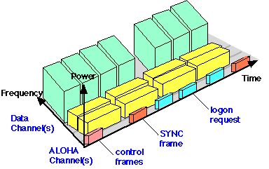 All transmissions by a user terminal are controlled by the NCC. Before a terminal can send data, it must first join the network by communicating (logon) with the NCC describing its configuration. The logon message is sent using a frequency channel also specified in the control messages. This channel is shared between user terminals wishing to join the network using the slotted ALOHA access protocol.