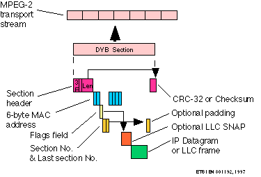 The multi-protocol extension encapsulates the data to be sent using a Medium Access Control (MAC) header (and optionally a Sub Network Access Protocol (SNAP) header). The bytes of the MAC header are re-arranged (to ease decoding by MPEG receivers with limited capability) and other section header information added. The encapsulated packet forms the first part of a DSM-CC section to which a trailer is added to control processing of the received section and also includes a CRC-32 checksum to protect the data. The entire DSMCC section is padded to an integral number of transport packets, and packetised into the MPEG transport stream.