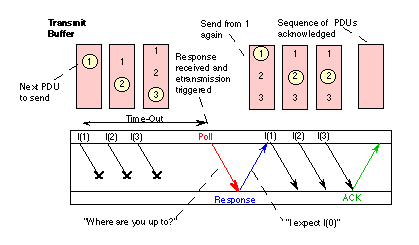 When the remote node receives this PDU, it replies by transmitting a response PDU indicating its current state. This process, if completed successfully, allows the local node to synchronise its send state information with the remote node's receive state information. (The synchronisation is performed in the direction of transmission of the poll PDU). This allows the transmitter to detect any frames which have not been successfully received and retransmit them.