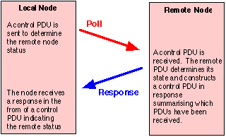 Polling is triggered when the sender/transmitter detects that it has not received an acknowledgment for a PDU which it has sent previously. It commences with the transmission of a control PDU indicating the current state, and requesting the remote node state (see figure).