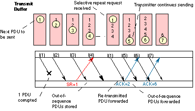 Upon receipt of a Selective Repeat control PDU (by the local node), the transmitter sends a single PDU from its buffer of unacknowledged PDUs. The transmitter then continues normal transmission of new PDUs until the PDUs are acknowledged or another selective repeat request is received.