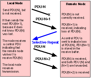 A remote node may request retransmission of corrupted PDUs by initiating Selective Repeat error recovery by sending a control PDU indicating the missing PDU. This allows the remote node to instruct the sending node where to retransmit the PDU which has not been received. The remote stores any out-of-sequence PDUs (i.e. which do not have the expected sequence number) until the retransmission is complete.
