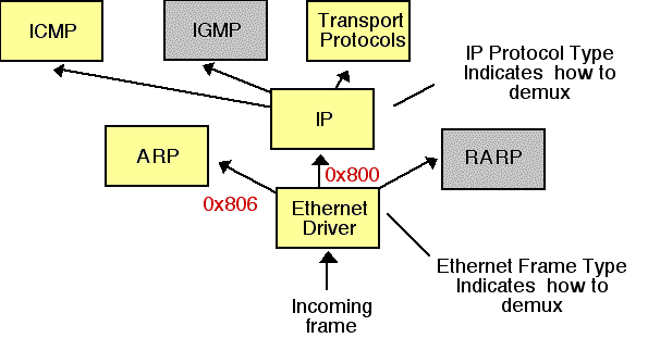 The following overview shows the demuxing performed by an end system in an IP system connected to an Ethernet network.