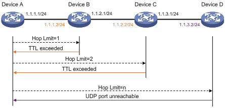 Traceoute being used across a path ABCD, and showing the results for each hop when a UDP datagram is used to probe with increasing IPv4 TTL.