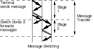 Most message switched networks do not use dedicated point-to-point links and therefore a call must be set-up using a circuit switched network. The figure below illustrates the use of message switching over a circuit switched network, in this case using one intermediate message switch.