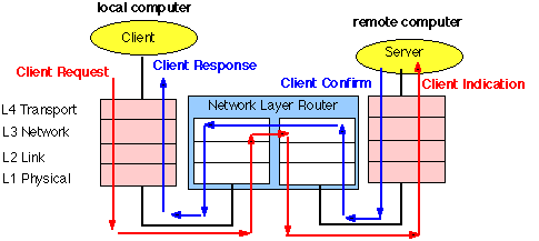 Assume that one end system (local computer) has a client program which requires the services of a remote server program located at a remote computer connected by a communications network. A simplified diagram is shown in the figure below. This shows the peer-to-peer communication.