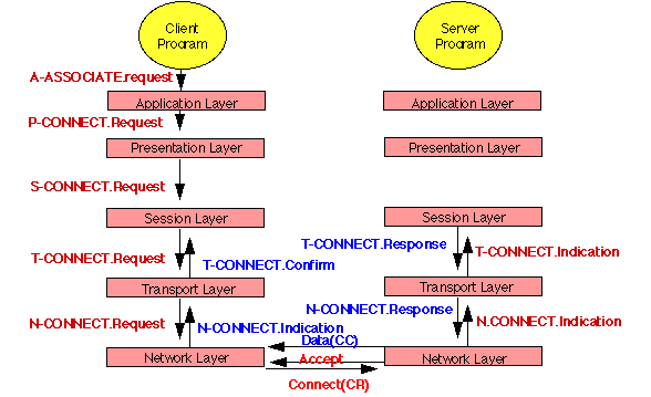 The received SDU identifies the session ID and the application process with which the client wishes to communicate. The presentation layer is sent a S-Connect indication, containing the presentation options requested by the client and the A-Associate request sent by the client. The application layer now attempts to connect to the server process. (In some cases, a new server program will be activated to handle this new request).