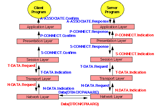 Once this has succeeded a response is generated, carrying the final details of the connection. This information is passed as an A-Associate response primitive to the application layer. At each layer additional PCI is added by the remote system, and finally an N-Data primitive is sent across the network layer service. At the receiver each layer verifies the information it receives, and confirms the successful connection. The application layer send an A-Associate confirm message to the client process which is then ready to transmit data.