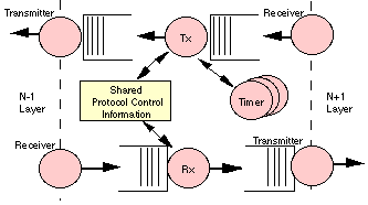 Protocols are usually implemented by writing a number of programs (processes) which communicate with one another through queues and by function calls. One or more timers are also usually required to ensure correct operation of the protocol. To start and stop timers, a protocol normally uses an interface to the computer's operating system. This interface is also used to request new (empty) buffers for received PDUs (or PDUs created by the layer) and to release buffers which are no longer needed by the protocol.