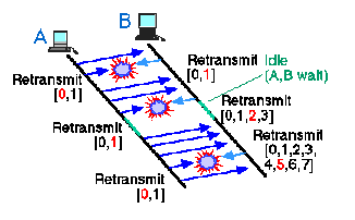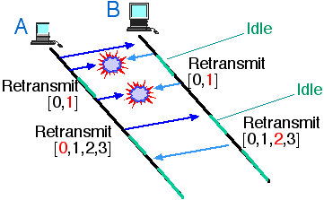 The figure above illustrates Ethernet Capture. Computer A dominates computer B. Originally both computers have data to transmit. A transmits first. A and B then both simultaneously try to transmit. B picks a larger retransmission interval than A (shown in red) and defers. A sends, then sends again. There is a short pause, and then both A and B attempt to resume transmission. A and B both back-off, however, since B was already in back-off (it failed to retransmit), it chooses from a larger range of back-off times (using the exponential back-off algorithm). A is therefore more likely to succeed, which it does in the example. The next pause in transmission, A and B both attempt to send, however, since this fails in this case, B further increases its back-off and is now unable to fairly compete with A.