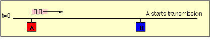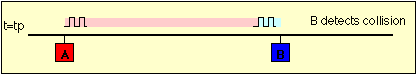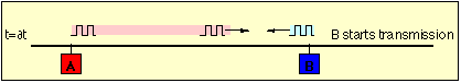 A short time later, NIC B also transmits. (In this case, the medium, as observed by the NIC at B happens to be idle too).