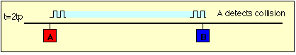 After a period, equal to the propagation delay of the network, the NIC at B detects the other transmission from A, and is aware of a collision, but NIC A has not yet observed that NIC B was also transmitting. B continues to transmit, sending the Ethernet Jam sequence (32 bits).