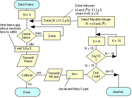 On a busy network, a retransmission may still collide with another retransmission (or possibly new frames being sent for the first time by another NIC). The protocol therefore counts the number of retransmission attempts (using a variable N in the above figure) and attempts to retransmit the same frame up to 15 times.