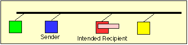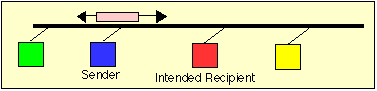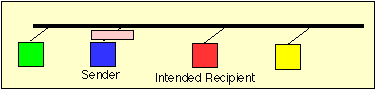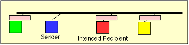 One computer (Blue) uses a NIC to send a frame to the shared medium, which has a destination address corresponding to the source address of the NIC in the red computer.