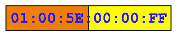Multicast destination addresses also comprise an OUI and a unique number, but in the case of IPv4 multicast, the former part is always 0x01005 (an OUI assigned to the IETF, shown highlighted in orange) and a group identifier (shown highlighted in yellow) that is derived from the Layer 3 multicast address. This address is mapped to the layer 2 destination address when multicast IP addresses are sent on an Ethernet LAN.
