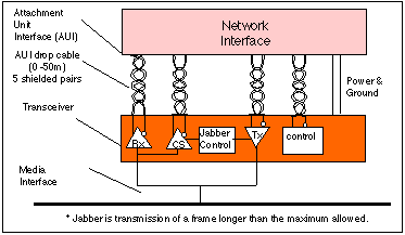 A 10 Mbps Ethernet Transceiver is connected to the Attachment Unit Interface (AUI) port of a network interface card, which is a 15-pin D-type connector. The port is connected with the transceiver using an AUI drop cable. This AUI cable consists of 5 pairs of twisted copper wires each covered by an individual screen. The cable has an AUI connector at each end and may be up to 50 meters in length (25m in some specific cases). (The Belden part number for this type of cable is 9901.)