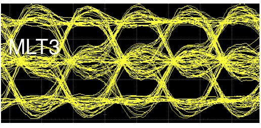 Eye Diagram showing the 3 levels of an MLT-3 encoded waveform. The size of the Fast Ethernet line symbol in microseconds, i.e. one baud as 1/125 micro secs.