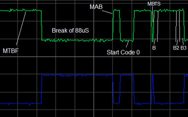 Note: A transmitter must always be set to produce a Break of at least 92 microseconds. The 1986 version of the Standard specified a 4 microsecond MAB period. The 1990 version of the standard changed the receiver value to 8 microseconds.