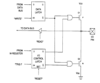 Reading can be performed by using a move instruction to clock a '1' into the I/O control latch, which will (via the Q output routed through the OR gate) switch OFF the upper FET (a p-channel type switches OFF when its input is high); simultaneously the '0' fed to the AND gate will switch OFF the lower FET. The output from the data latch is irrelevant as both FETs are OFF and the port is disabled . Data may now be read from the port pin.