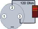 The receivers on a bus are connected together using cables with one male and one female XLR plug. These cable are wired so that pin 2 connects to pin 2, pin 3 connects to pin 3. The shield (also known as a shield) is wired to pin 1 at both ends of the cable.