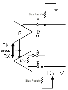 Two important additional physical layer requirements for RDM are that the controller output must be terminated and it must provide a bias circuit to keep the cable in the ‘marking state’ when no driver is enabled. The first requirement is needed because other devices may send signals on the DMX bus and hence it is essential that bot ends of the cable are terminated (it was good practice anyway with standard DMX). The second requirement arises because the controller does not always send a signal - this means that the conductors would float and could easily pickup noise, instead RDM requires the controller to use a bias network.