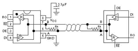 Use of a typical driver chip, showing the termination resistance, Rt. RE and DE are respectively the receive and transmit driver enable pins.