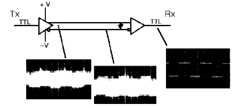 Typical line driver for differential transmission, showing a balanced line transmitter and a line receiver.
