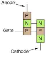 The simple electronic switch may be built using a thyristor. A thyristor is also known as a silicon controlled rectifier (SCR). It consists of 4 layers, similar to a pair of cross-connected transistors. The device has three terminals, one common, one connects the load and one the gate. The device fires when the gate is above a threshold, and remains on (i.e., conducting), until the power to the anode is removed.
