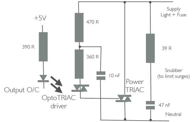 Solid state relays provide the circuitry for mains control in a simple single package. They are manufactured with either a zero voltage turn on (suitable for switching) or a random turn on, also known as instantaneous (suitable for dimmer applications). They can be either ac or dc voltage controlled. The ac version can be used for dc, which uses just half of the device.