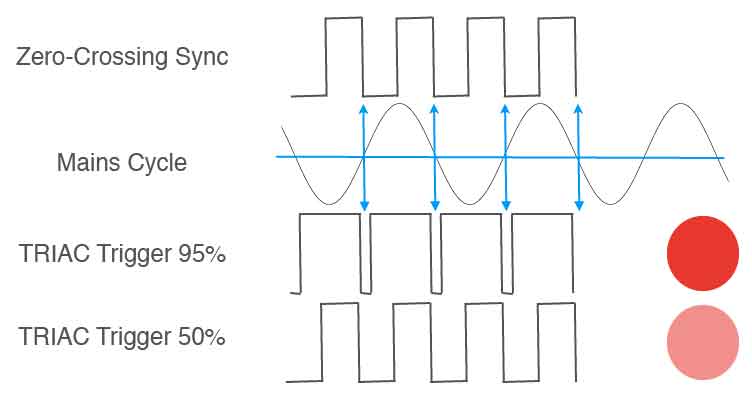 For example, the trigger signal for 20% output is the last 20% of each half cycle (positive and negative part of the cycle). The trigger signal for 75% output is the last 75% of each half cycle (positive and negative part of the cycle). The trigger pulse must complete before the end of the half cycle, to avoid ambiguous firing in the next cycle. The output waveform therefore comprises partial cycles of the mains 50 Hz waveform.