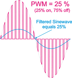 Chopped mains signal using a PWM signal with a 25% duty cycle. the blue signal shows the effect of filtering the choped signal (red), resulting in a near sine-wave.