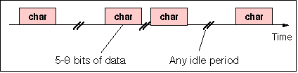 The arbitrary length of the idle period means there need be no timing relationship between successive characters (or bytes of data). Individual characters may be separated by any arbitrary idle period.