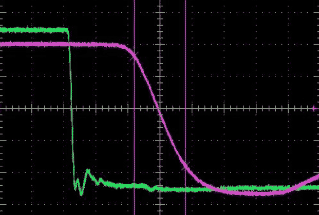 Trace showing the effect of limiting slew rate at a receiver when sending a 125 kHz square wave. Green traces show the input to receiver from the cable with ringing and noise, whereas the purple trace captured at the output is cleaner. Note also the propagation delay (shift on the horizontal axes) through the receiver, and the need to sample at the centre of the baud.